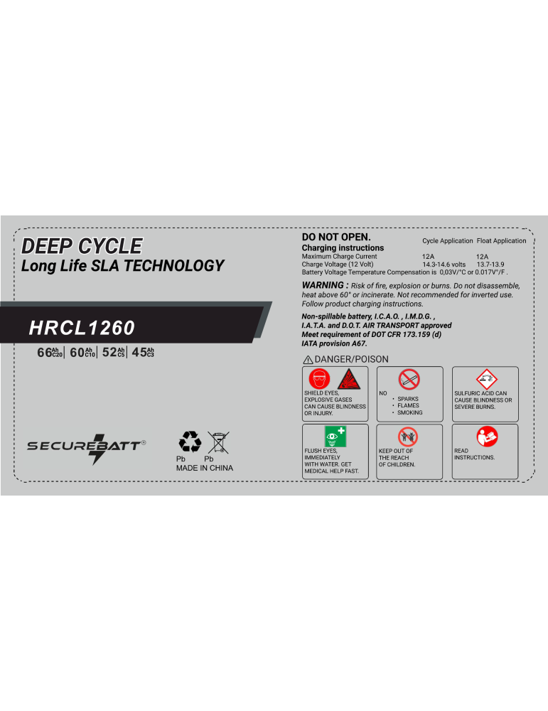 BATTERIE SECUREBATT HRCL1260 12V 66Ah C20 VEHICULE ELECTRIQUE - ENERGIE RENOUVELABLE